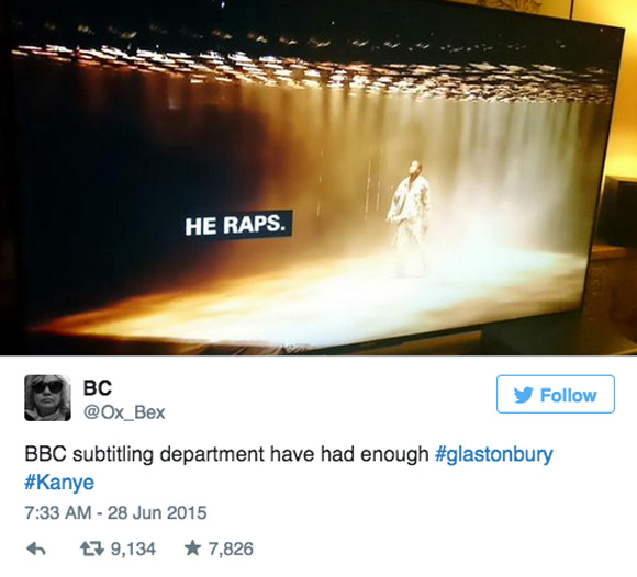 Whomever had the – ahem – enviable task of subtitling Kanye West’s Glastonbury performance in live time clearly gave up on life while trying to live-title the performance in a PG-rating.
