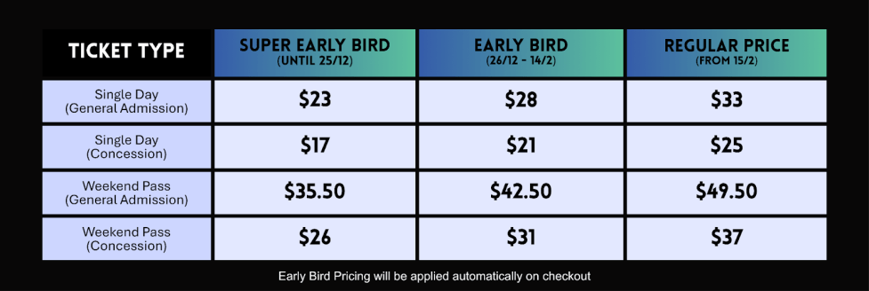 Purchase your Sydney Guitar Show tickets online now and save, with Super Early Bird prices available until 25th December. https://guitarshow.au/tickets/