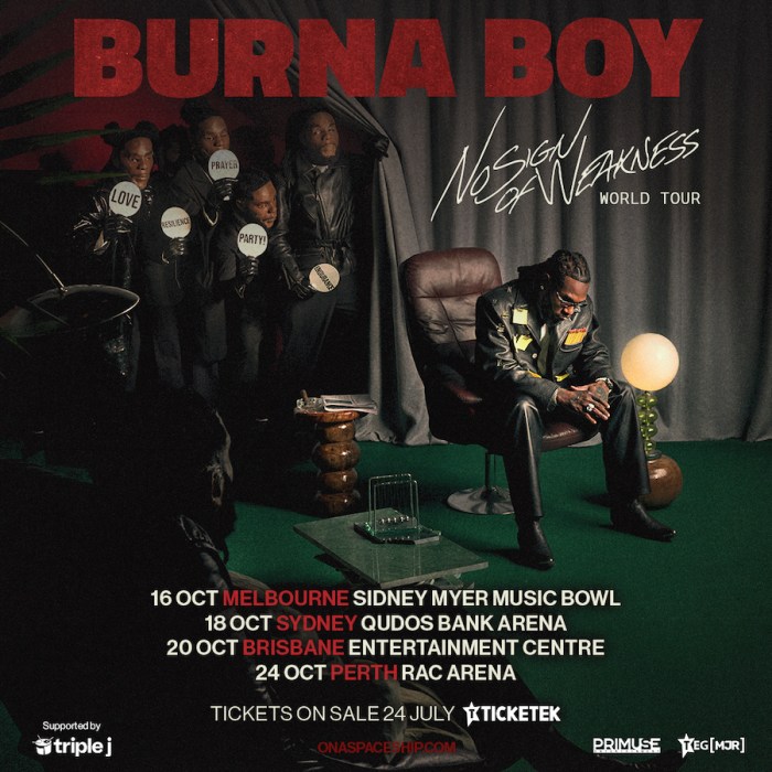 GRAMMYยฎ Award-winning universal icon Burna Boy will celebrate his eagerly awaited eighth studio album, No Sign Of Weakness, with an epic global tour that will include Australia with four exhilarating shows at some of the countryโs most credible venues. The No Sign Of Weakness Australia Tour will kick off in Melbourne on 16 October at Sidney Myer Music Bowl, before moving … Continue reading BURNA BOY ANNOUNCES AUSTRALIA DATES FOR ‘NO SIGN OF WEAKNESS’ WORLD TOUR