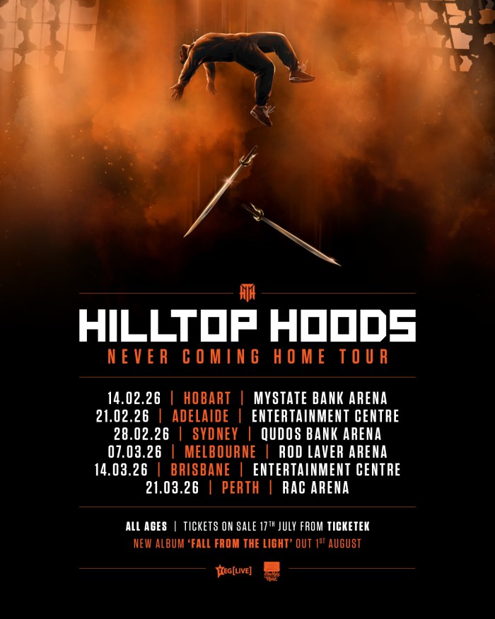 Australian hip-hop royalty Hilltop Hoods are returning in full force, today announcing their Never Coming Home national tour - a run of capital city arena shows set to shake stages in early 2026. With their signature blend of powerful lyricism, infectious beats and razor-sharp production, the Hoods are gearing up to deliver an unforgettable live experience - bringing their … Continue reading HILLTOP HOODS ANNOUNCE โNEVER COMING HOMEโ NATIONAL ARENA TOURย AND NEW ALBUM ‘FALL FROM THE LIGHT’