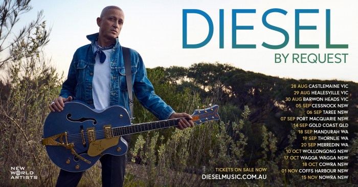 ONE-OF-A-KIND MUSICAL CONVERSATION BETWEEN ARTIST & AUDIENCE SET TO TAKE PLACE THIS AUGUST THROUGH TO NOVEMBER Australia, prepare to witness beloved singer-songwriter and musician Diesel like never before, the talented roots rock guitarist is set to deliver an unforgettable live experience for fans this August, September, October and November. Offering a one-of-a-kind conversation between artist and audience, Dieselโs, … Continue reading DIESEL ANNOUNCESย BY REQUEST REGIONAL TOUR