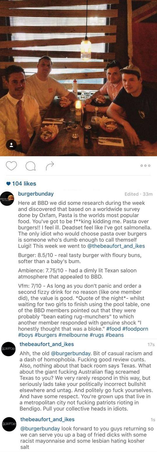 Here's one for the WTF files this week. There was an Instagram account (yes, was) called Burger Bun Day based in Melbourne, Australia, that would visit various establishments and give a review of their food. That is, until they visited a place in Carlton called The Beaufort. For some reason, on this particular day the lads … Continue reading Food Review Insta Account Rekt By Restaurant